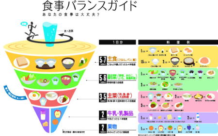 食事バランスガイドを具体的にどのように日々の食生活に用いたらよいでしょうか。今までの食事の献立ガイドには、栄養素など細かな数値を用いてきました。そのため、専門的な知識がないとどうしていいか分からないことも多くありました。そこで、今回の食事バランスガイドでは、栄養や食品に関する細かな知識の無い人にも分かりやすく、実践しやすいことを第一として、「料理レベル」でおおよその量を示しています。 食事バランスガイドを活用するには、まず最初に、自分の1日の活動量やライフスタイルに見合った5区分の料理(主食・主菜・副菜・乳類・果物)の適量範囲を考え、好みの料理を選んで食事を組み立ててください。食事バランスガイドには、1日を単位として望ましい摂取量が示されています。1日の食事が基本ですが、あまり厳密には考えず、エネルギーや栄養素の過不足は少し長い期間での調整でも十分可能です。エネルギー摂取が過剰になると1ヶ月程度の期間で体重や腹囲(ウエストサイズ)に現れてきますので、その変化を自己チェックし、摂取量を調整します。また、エネルギーのバランスを考え、それ相応の運動(活動量)をすることも大切です。