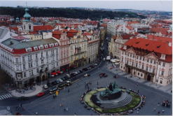 プラハ旧市街広場。チェコにおける宗教改革の先駆者ヤン・フスの像が見える。