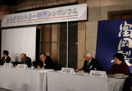 「21世紀のシルクカントリー群馬」シンポジウム。右から森まゆみ(作家)、茂木雅雄(大日本蚕糸会理事)、藤森照信(東大教授)、佐藤好祐(宮内庁御養蚕所主任)の皆さんら