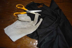ヒヨドリの救出のための道具(ハサミ・皮作業手袋・黒い布袋)。皮作業手袋は、とっても有効でした。