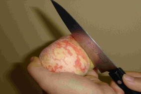 桃を二つに分けるくぼみに,軽くナイフを入れる