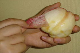 うまい桃は,むいた手にも味が伝わる。