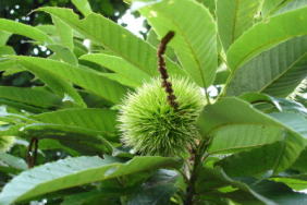 雄花の花穂を付けたままの栗。へんな栗。