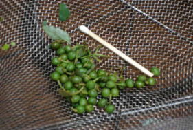 サンショの実をばらばらにしました。マッチの軸木と大きさ比べ。