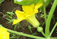 黄色い花の下側に,丸いカボチャの赤ちゃん(めしべの子房)が付いている。