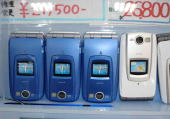 電気店にまで、たくさんの携帯電話が並ぶ。公衆電話ボックスは、市街から消えた。(万博には関係ないが、)