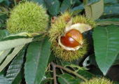 見上げると,ぱっくりと口を開けた栗がいくつかあった。3人兄弟?の栗は、真ん中だけが太っていた。