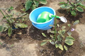 梅雨の真っ只中で、ナスに水くれ。
