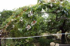 このHPの勝ちゃんの 家庭で楽しむ果物作り第3回「ブルーベリーを鳥から守ろう」を私も読んで、桃の木に防鳥ネットを架けました。(夫に息子に夫の友人と私の4人がかり)これってすごく大変。でもどうやってネットをはずすの?。